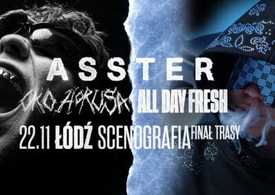 Asster wraca do klubów, z dwoma a nie jedną trasą koncertową! Już w październiku będziecie mieli wyjątkową i jedyną okazje, by usłyszeć na żywo szeroki przekrój materiału z dwóch ostatnich albumów – ulicznego i przewózkowego „ALL DAY FRESH” oraz osobistego i energicznego „OKA HORUSA”.