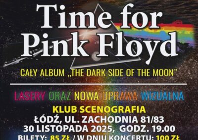 TIME FOR PINK FLOYD gra na żywo największe przeboje zespołu PINK FLOYD z wyjątkową oprawą wizualną, oświetleniową i laserową. 11 osób na scenie, w tym dwoje charyzmatycznych wokalistów.