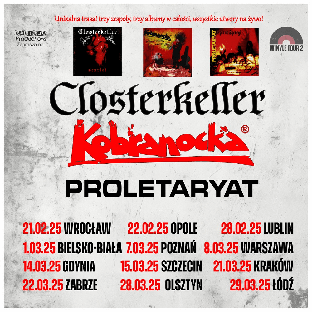 Przygotujcie się na muzyczną podróż w czasie, bo Winyle Tour 2 zbliża się wielkimi krokami, łącząc na jednej scenie trzy ikony polskiej sceny muzycznej – Kobranockę, Proletaryat i Closterkeller. To niepowtarzalne wydarzenie zabierze Was w nostalgiczny świat lat 80. i 90., gdzie każdy z zespołów zaprezentuje w całości swoje kultowe albumy, oferując nie tylko znane hity, ale także niezapomniane emocje i energię. Zarezerwujcie daty w swoich kalendarzach, bo te magiczne wieczory zapadną Wam w pamięć na zawsze!